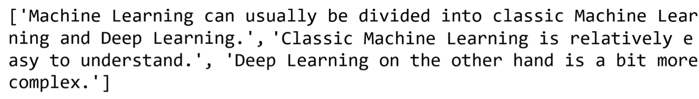As you can see, we successfully separated our original text, which consisted of three sentences, into a list of three members where each member is one of the sentences.